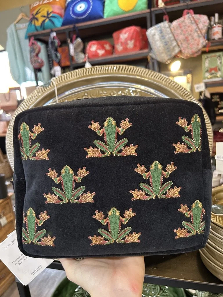 And if you want a little witchy whimsy – look no further! We have our new spooky range of Elizabeth Scarlett pouches, wash bags and coin purses. Beautifully embroidered green and gold frogs on a plush black velvet background, perfect for this time of year but also useful year-round! As always, we only get select quantities of our items in, and the frogs are selling faster than you can say abracadabra!
